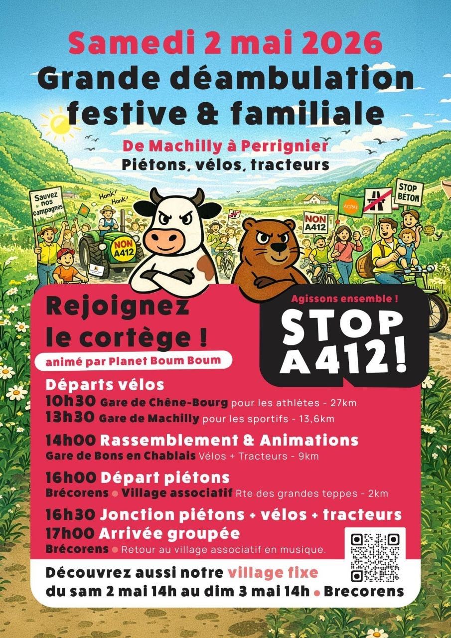 Samedi 2 mai, rassemblement à Bons-en-Chablais, puis déambulation à vélo ou piétonne jusqu’au village associatif à Perrignier pour des prises de parole sur la lutte et une soirée de concerts.