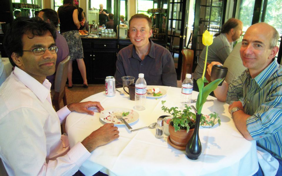 Sendhil Mullianathan, Elon Musk et Jeff Bezos photographiés pendant la Edge Master Class 2008 (source : Edge Foundation)
